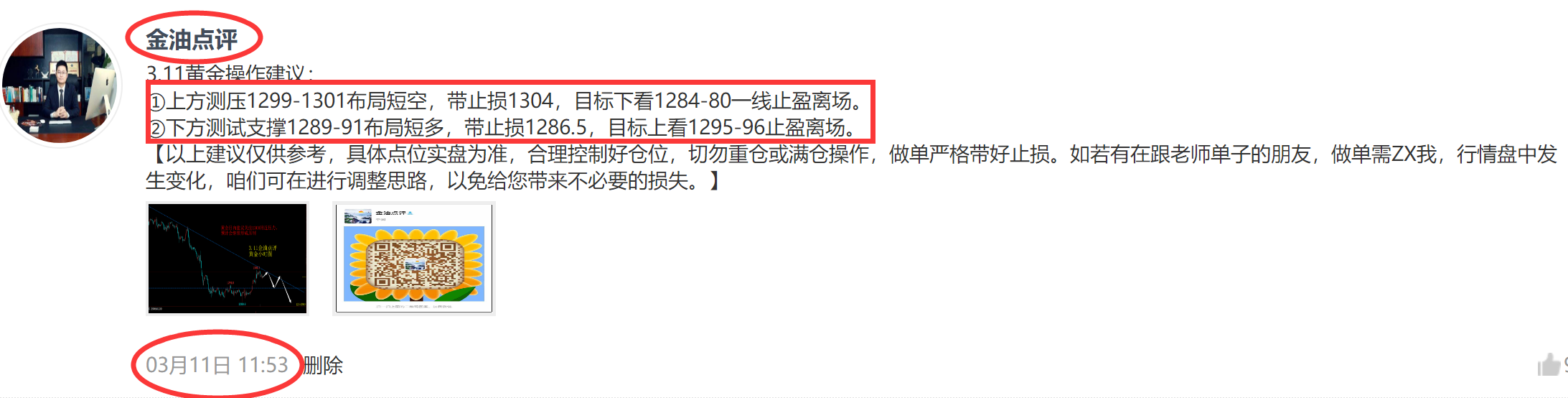 中午12点钟,金油点评老师专栏给出黄金建议1299一线做空,目标看到1294-90一线,空单完美止盈700美金利润。