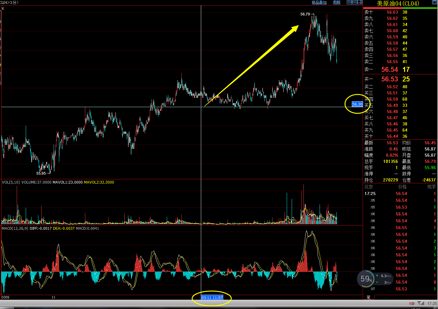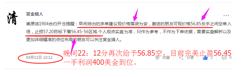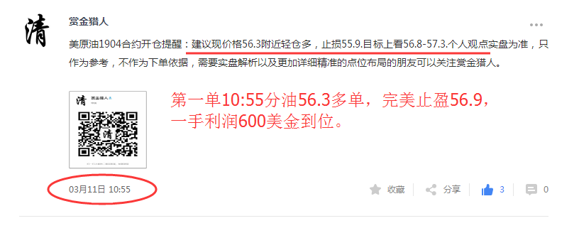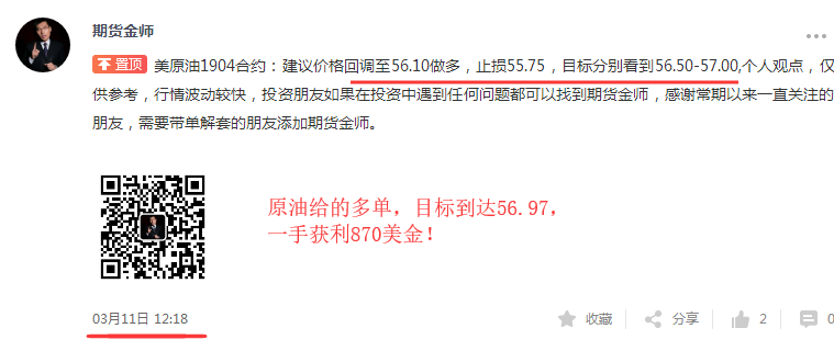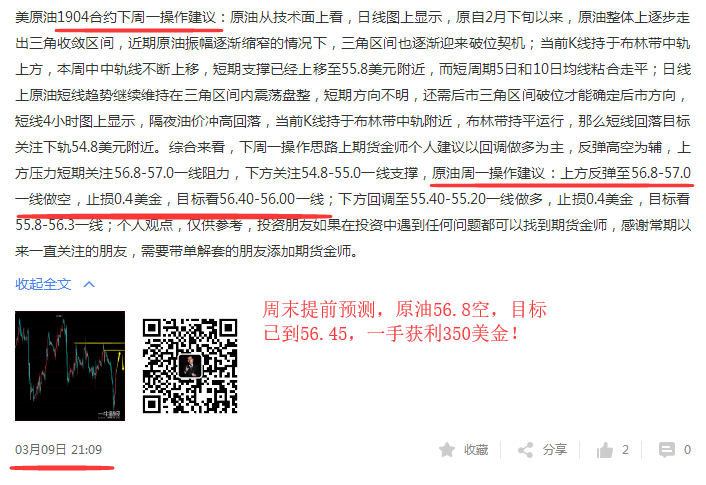 周末提前预测原油:观点给出原油56.80空,目标已到56.45,一手获利35个点(净赚350美金)所给的单子,均有可迹,投资朋友需要带单解套以及点位布局都可以找期货金师,感谢长期以来关注的朋友。