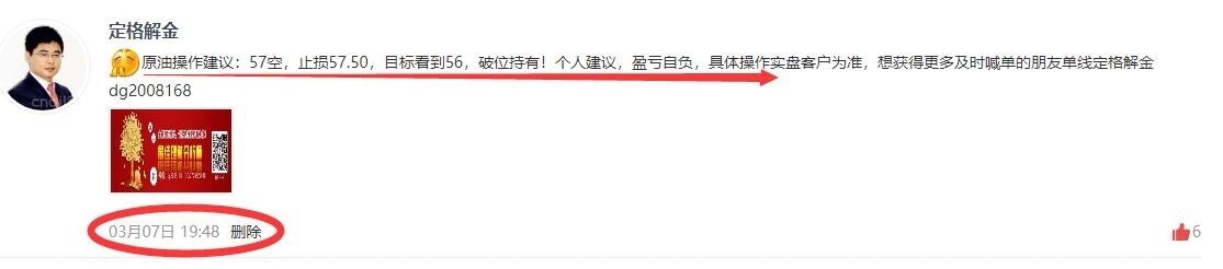 观点19:48分给出原油57空,目标行情已到56.30下方,最大盈利近70个点,恭喜跟上操作的实盘朋友!需要带单或者想解套的朋友添加定格解金dg2008168