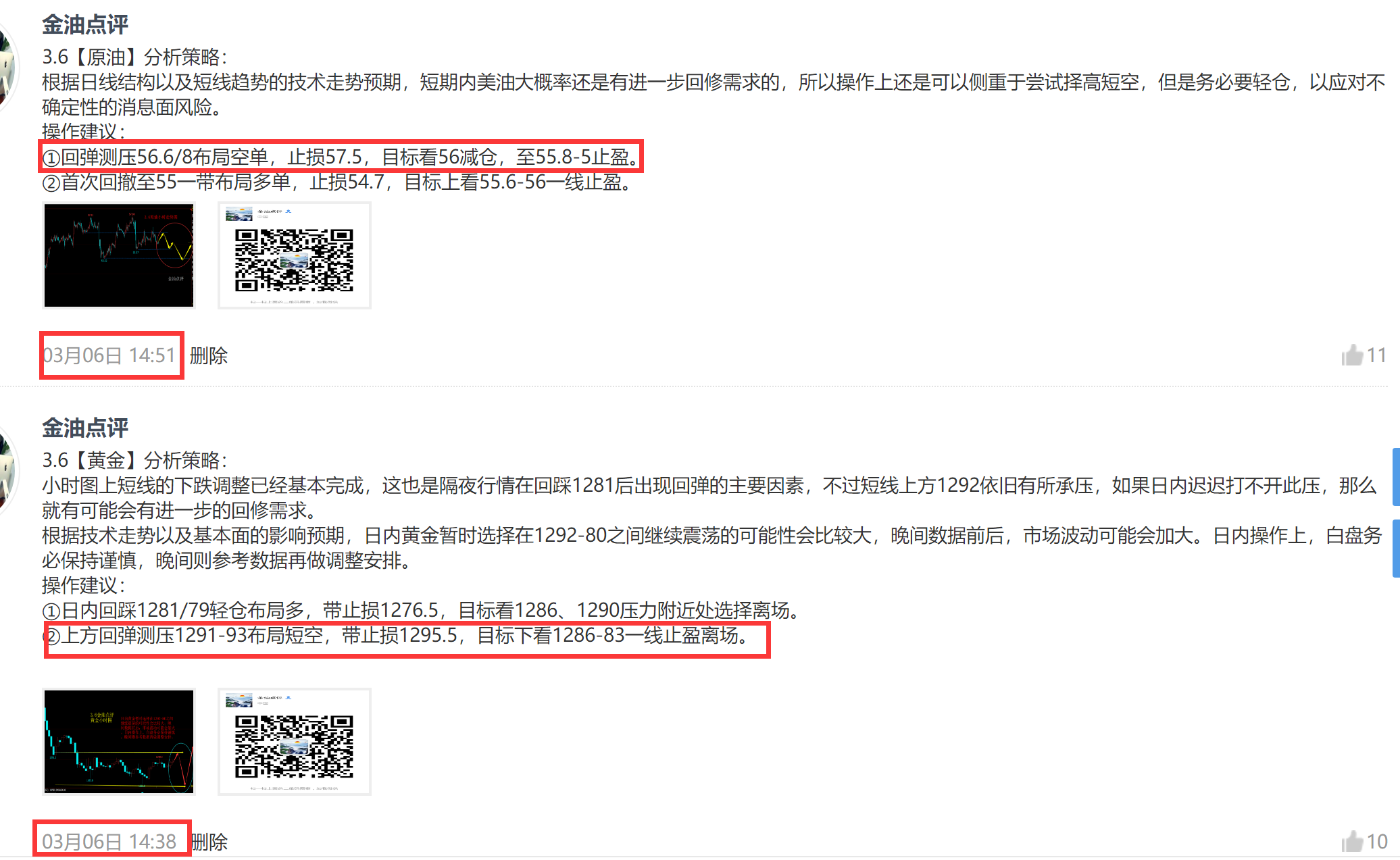 黄金 原油 盈利总结: 下午14:37分,金油点评给出黄金1291一线空单,目标下看到1286-83。通知实盘全部在1285做了止盈,单手完美止盈600美金。 下午14:51分,金油点评老师又给出原油56.8一线空单,目标看到55.8-5一线止盈,空单再次斩获1100美金利润。 【 如若有需要喊单,解套及实盘指导的朋友,可以扫一扫下方二维码】