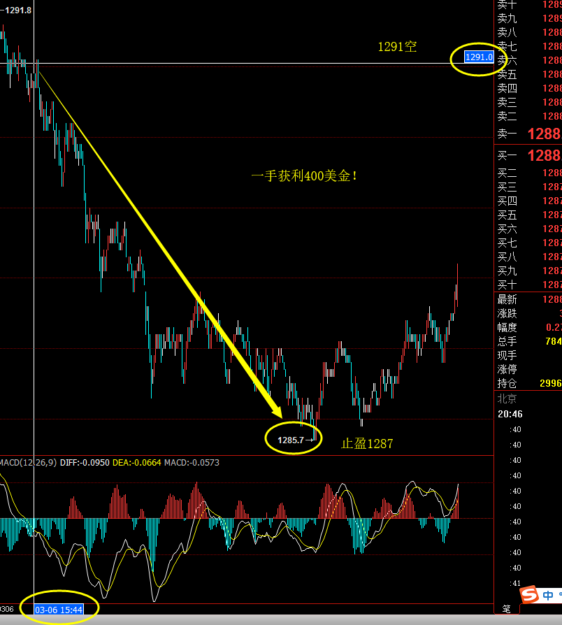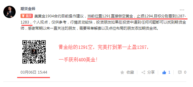 恭喜黄金1291空单进场的朋友,目标已到第一止盈1287,一手获利400美金,投资朋友需要带单解套以及点位布局都可以找期货金师,感谢长期以来关注的朋友。