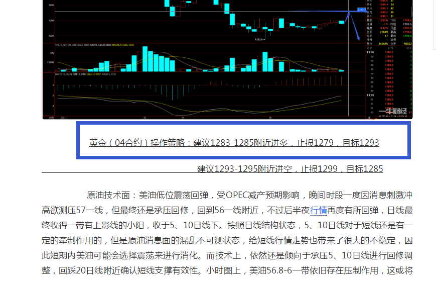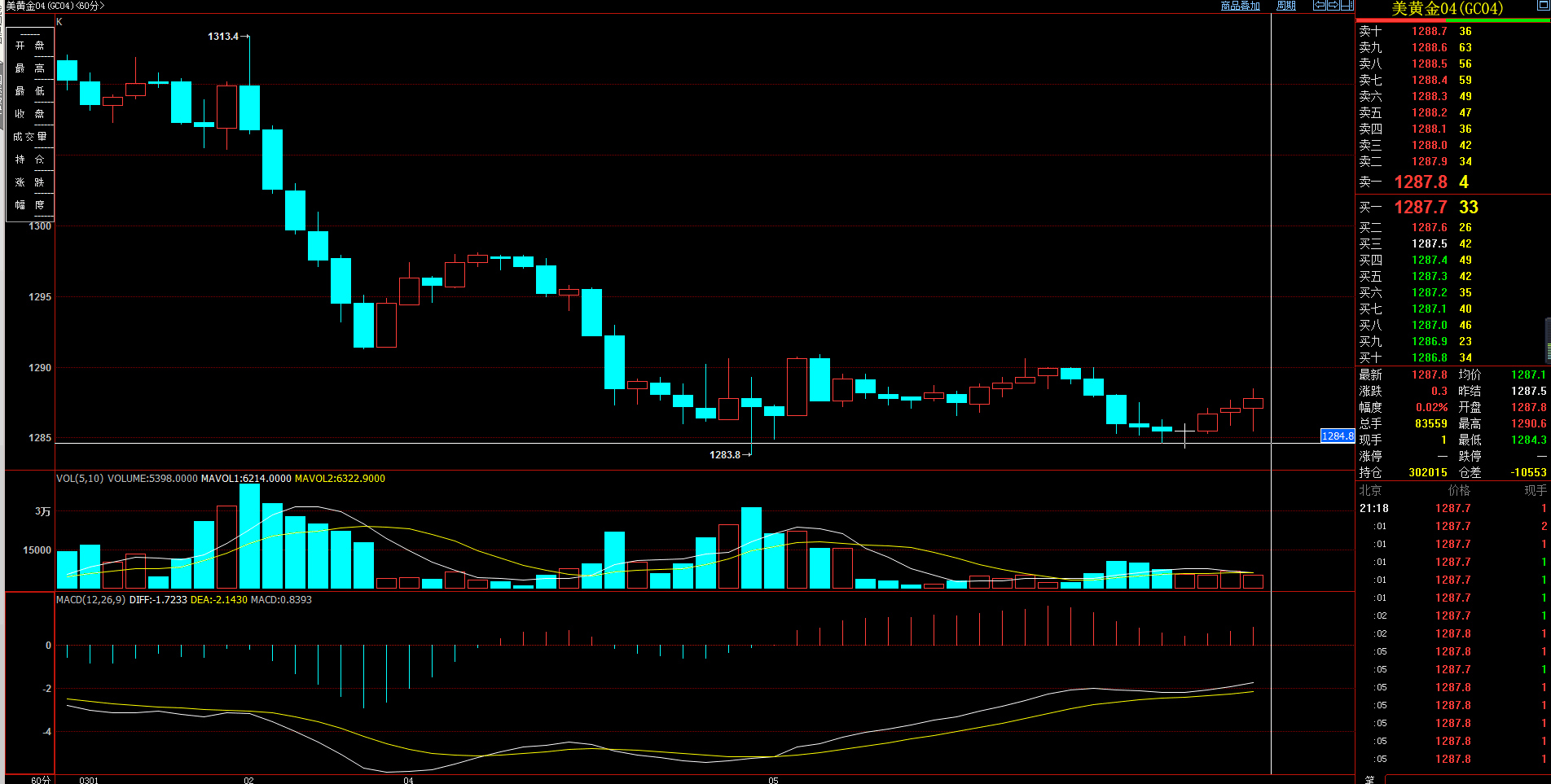今日建议高位空单仍然可以持有不动,波段交易者可以等待反弹1295一线加仓机会,不反弹则不轻易加仓!至于短线交易者不妨考虑在1280上方轻仓买入,切记不宜恋战,目标临盘决断,快进快出。