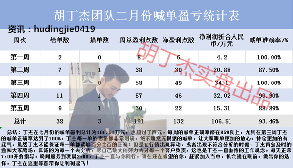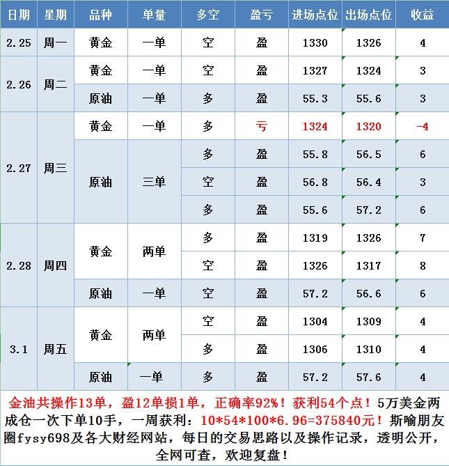 一月已过,有关注斯喻的朋友应该知道,斯喻这边在本月的操作可谓是可圈可点,从年后开始投入工作,到本周交易结束,三周一个月,金油共计操作12+10+13=35单,损2单,获利33单,一个月喊单正确率高达94%,金油共计获利157个点,按照5W美金两层仓操作,一次下单10,一月获利107万余!开仓有把握,建仓有着落,持仓有风控,平仓有利润。斯喻的文章以及圈子策略每天坚持更新中,没有日获百万盈利刺激你眼球,只不过是让你按着我的分析节奏一次赚上五六个点,公道自在人心,能不能赚钱不是我说了算,而是你的账户说了算,就让行情去证明谁才是市场的常青树。【更多资讯fysy698】