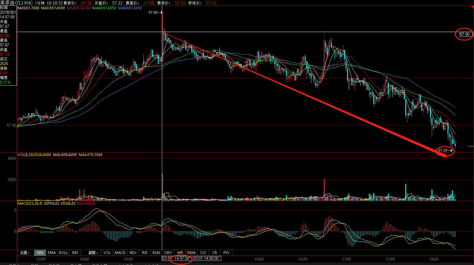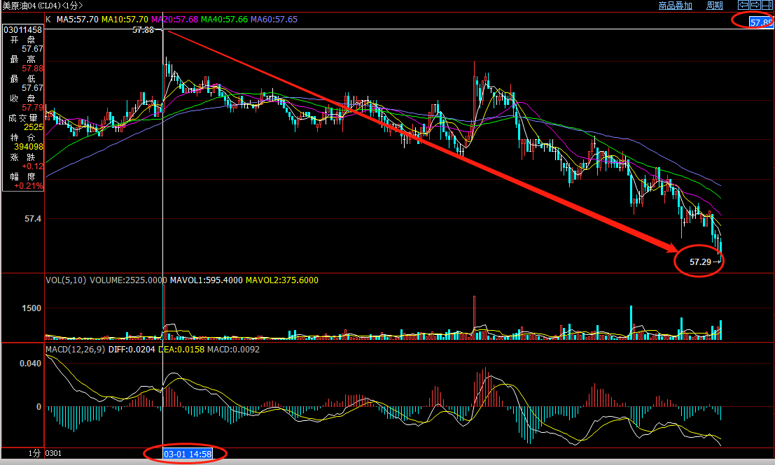 原油04合约操作思路:(1)57.35附近多单进场,止损57.0,止盈57.75-58!